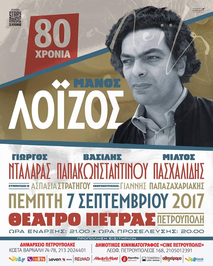 Μερικά από τα πιο αγαπημένα μας τραγούδια θα ακουστούν στη μεγάλη συναυλία – αφιέρωμα στον Μάνο Λοΐζο, την Πέμπτη 7 του Σεπτέμβρη, στο Θέατρο Πέτρας στην Πετρούπολη, με αφορμή τα 80 χρόνια από τη γέννησή του. Ένα μουσικό ταξίδι με τις μελωδίες του αξέχαστου δημιουργού και τις φωνές των Γ. Νταλάρα, Β. Παπακωνσταντίνου, Μ. Πασχαλίδη και Ασπ. Στρατηγού.