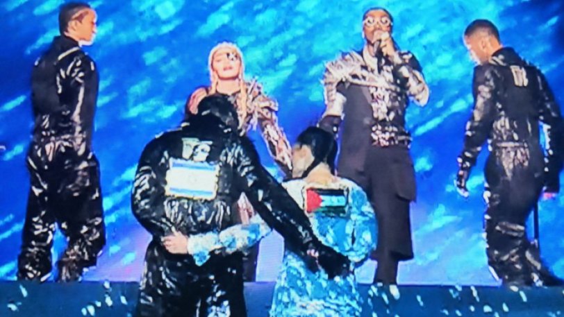 Αυτό μέχρι τη στιγμή που ανέβηκε στη σκηνή η Μαντόνα, που υπενθυμίζουμε ότι είχε δεχτεί μεγάλη κριτική για την απόφασή της να συμμετάσχει στο διαγωνισμό, για τον οποίο είχε αναπτυχθεί ένα διεθνές κίνημα μποϊκοτάζ. Η ίδια, χωρίς να κάνει την υπέρβαση (παρεμπιπτόντως ούτε σκηνικά ή φωνητικά), αποφάσισε να εξισορροπήσει κάπως την υστεροφημία της, εμφανίζοντας δυο χορευτές της με την ισραηλινή και παλαιστινιακή σημαία αγκαλιασμένους επί σκηνής. Ανάμεσα στα τραγούδια “Like a prayer” και “Future”, η Μαντόνα απευθύνθηκε σε μορφές με αντιασφυξιογόνες μάσκες, λέγοντας: “Είναι τόσο αφελείς – θεωρούν πως δεν έχουμε συναίσθηση των εγκλημάτων τους. Η καταιγίδα δεν είναι στον αέρα, είναι μέσα μας. Θέλω να σας πω για την αγάπη και τη μοναξιά. Αλλά τώρα είναι σχεδόν αργά. Δεν μπορείτε να ακούσετε έξω από τις εξαίσιες κουκούλες σας, τον αέρα που αρχίζει να θρασομανάει;” Κλείνοντας, ψιθύρισε “Ξυπνήστε”, προτροπή που εμφανίστηκε και σε γιγαντοοθόνη πίσω της. H κίνηση εξόργισε τους διοργανώτες, που έσπευσαν να βγάλουν ανακοίνωση με την οποία ξεκαθάριζαν πως το στιγμιότυπο δεν είχε προσχεδιαστεί και πως η τραγουδίστρια είχε προειδοποιηθεί ότι η Eurovision είναι “μη πολιτικός διαγωνισμός”.
