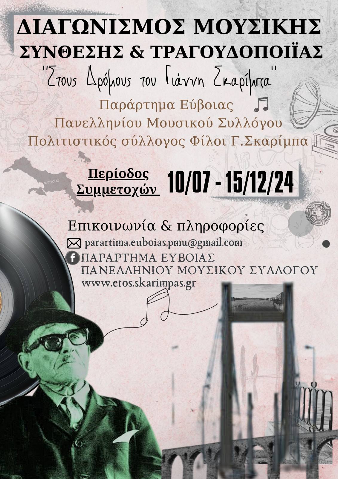 Ανακοινώθηκε ο μουσικός διαγωνισμός σύνθεσης και τραγουδοποιίας για το ΕΤΟΣ ΣΚΑΡΙΜΠΑ με πρωτοβουλία του Πανελλήνιου Μουσικού Συλλόγου-Παράρτημα Εύβοιας και με τη συνεργασία του Συλλόγου Φίλων Γ. Σκαρίμπα.