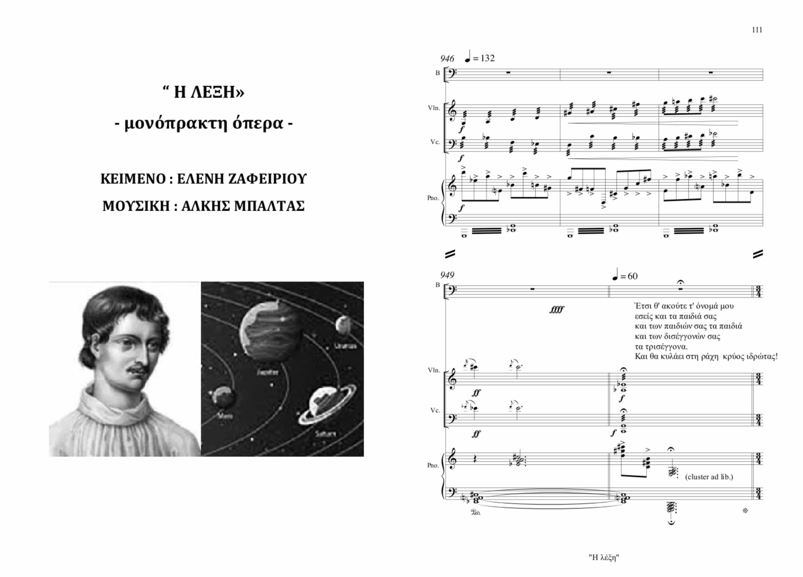 Ο διεθνούς φήμης συνθέτης και μαέστρος, Άλκης Μπαλτάς, συγκινήθηκε, προβληματίστηκε και εμπνεύστηκε από το λιμπρέτο της Ελένης Ζαφειρίου, με αποτέλεσμα να δημιουργήσει μια όπερα (δωματίου), που να είναι συμβατή και συγκλίνουσα με την υπόθεση του λιμπρέτου. Και πράγματι δημιούργησε μια θαυμάσια μουσική σύνθεση, μοναδική αισθητικά και γενικότερα καλλιτεχνικά. Μια όπερα με ορισμένα στοιχεία της μπαρόκ εποχής και της μπαρόκ όπερας (με έμφαση στο συναίσθημα, κατά σημεία και με χρησιμοποίηση τσέμπαλου και βιολοντσέλου) (η οποία μπαρόκ όπερα ιστορικά μάλλον γεννήθηκε το 1600, τη χρονιά του θανάτου του Τζορντάνο Μπρούνο), της θρησκευτικής δυτικής μουσικής κ.ά. μουσικών δρόμων, που ο ίδιος γνωρίζει πολύ καλά. (Βέβαια, ο Άλκης Μπαλτάς έγραψε και άλλη όπερα πάνω στο λιμπρέτο «Προμηθέας/Δεσμώτες» της Ελένης Ζαφειρίου, το οποίο βρίσκεται κι αυτό στο βιβλίο της «Όπως το κέλυφος ενός απέραντου ναυτίλου», Εκδ. ΣΥΓΧΡΟΝΗ ΕΠΟΧΗ, Αθήνα 2025, σελ. 21-79.)