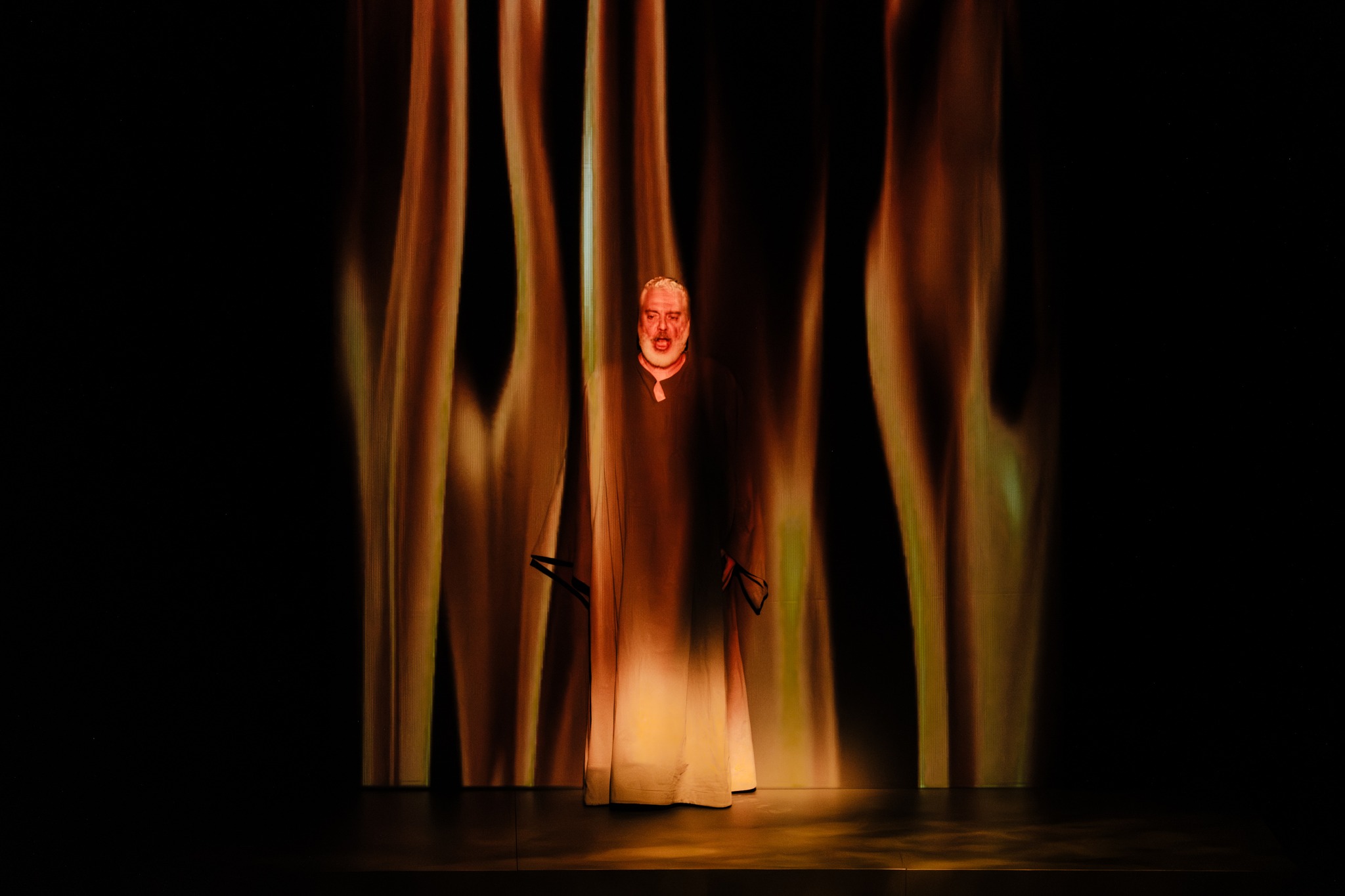 Βέβαια, οι άριες κυριαρχούσαν είτε με θλιμμένο ύφος είτε με έντονο, εκρηκτικό, κατά σημεία, υποδηλώνοντας από τη μια την πάλη του ήρωα, ο οποίος κάποια στιγμή έρχεται σε εσωτερική σύγκρουση με τη συνείδησή του και θα πρέπει να διαλέξει να υπερασπίσει ή να αρνηθεί τις ιδέες του, όταν μάλιστα βρεθεί στην τραγική θέση προ του θανάτου…, μέσα στη φυλακή, και από την άλλη τις έντονες αναμνήσεις, την ταλαιπωρία από την εξόριστη πολύχρονη ζωή του και από το κατηγορητήριό του ενάντια στην Ιερά Εξέταση (αντί απολογίας του), στο δικαστήριο, μέχρι το τέλος του, που τον βλέπουμε να «καίγεται» ζωντανός μέσα στη φωτιά (υπέροχο σκηνοθετικό εύρημα, με τη βοήθεια βίντεο, γεμάτο με φλόγες…).
