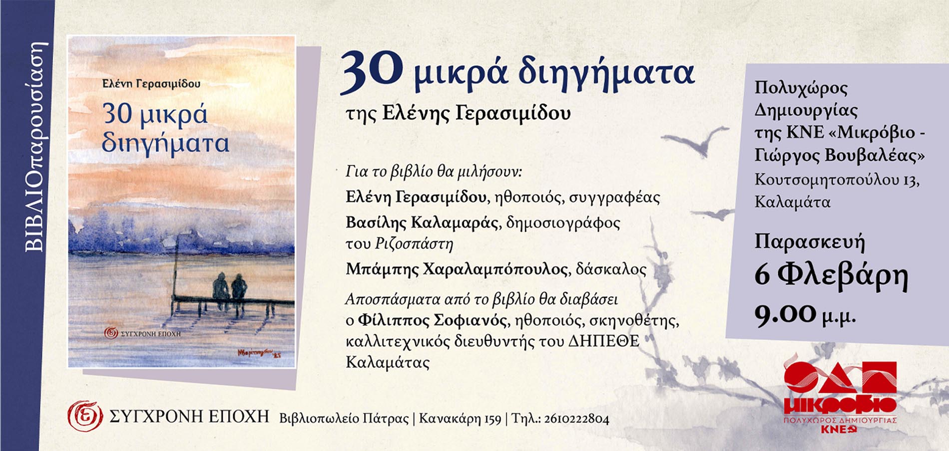 Οι εκδόσεις “Σύγχρονη Εποχή” παρουσιάζουν το βιβλίο της Ελένης Γερασιμίδου «30 μικρά διηγήματα», την Παρασκευή 6 Φλεβάρη στις 9 μ.μ. στην Καλαμάτα.