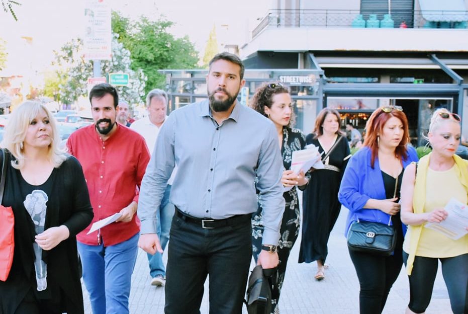 Περιοδεία κλιμακίου της Λαϊκής Συσπείρωσης με επικεφαλής το δήμαρχο, Βαγγέλη Σίμο στα εμπορικά μαγαζιά της Πετρούπολης, καθώς και στη Δραματική Σχολή του δήμου.