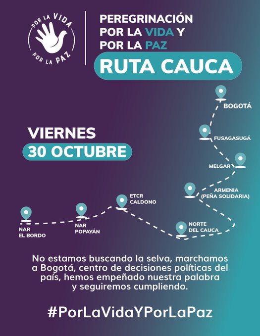 Κεντρικό αίτημα της πορείας είναι ο σεβασμός στις ειρηνευτικές συμφωνίες του 2016, που καταπατώνται όλα αυτά τα χρόνια με εκατοντάδες θύματα μεταξύ των πρώην ανταρτών και άλλων κοινωνικών αγωνιστών.