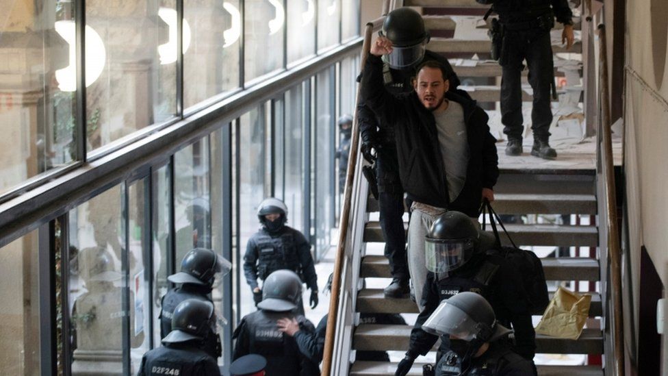 Ο Hasel, καταδικασμένος από το Ανώτατο δικαστήριο της Ισπανίας με τις κατηγορίες ότι επαινεί την τρομοκρατία και συκοφαντεί το κράτος και τους βασιλικούς θεσμούς, συνελήφθη από την αστυνομία της Καταλονίας, παρά το κύμα αλληλεγγύης και συμπ...