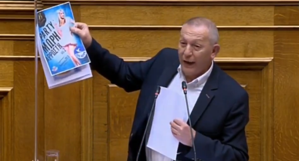 “Party μωρή άρρωστη! Πάρτη με 6 ευρώ…” – Ο Παφίλης καταθέτει στη Βουλή τις αφίσες της ΔΑΠ και τον… ιδεολογικό της πλούτο! (VIDEO)