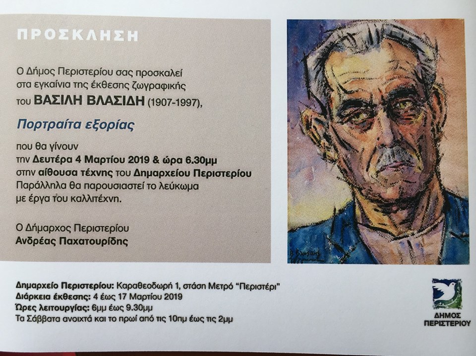 Ο Δήμος Περιστερίου φιλοξενεί από τις 4 ως τις 17 Μαρτίου 2019 έκθεση με έργα του Βασίλη Βλασίδη με τίτλο "Πορτραίτα Εξορίας" - Παράλληλα θα γίνει και η παρουσία του λευκώματος με έργα του ζωγράφου που επιμελήθηκε και εξέδωσε ο Κώστας Λυγια...